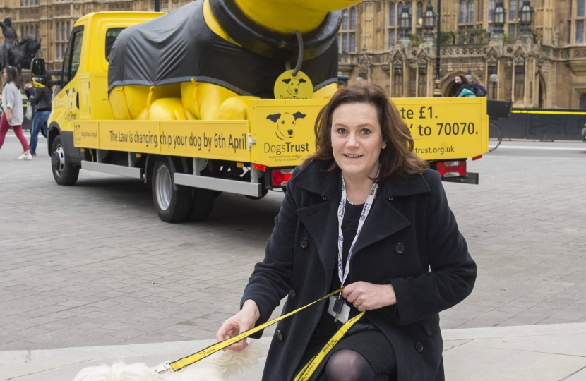 With just one week to go before microchipping becomes compulsory in England, Scotland and Wales, Dogs Trust, the UK’s largest dog welfare charity, brings its larger than life mascot ‘Dogcilla’ to meet Rebecca Harris MP for Castle Point at Westminster, following a 145,942 mile cross-country tour to raise awareness of microchipping law changes coming into effect on 6th April this year.